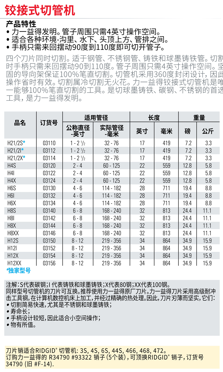 四个刀片同时切割。适于钢管、不锈钢管、铸铁和球墨铸铁管。切割时手柄只需来回摆动90到110度。管子周围只需4寸操作空间。坚固的导向架有效笔直切割。切管机是360度封闭设计,因此操作省时有效。切割属冷切割无火花。力得铰接式切管机是能够笔直切割的工具。是切球墨铸铁、碳钢、不锈钢的优选工具,是REED力得的设计。